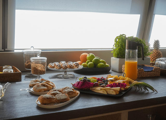 Every meal is an experience, whether it’s a casual breakfast on the flybridge or an elegant dinner anchored in a secluded bay.