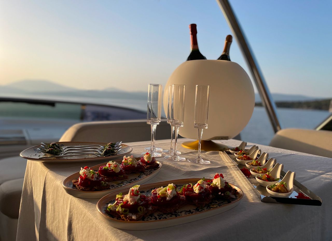 Sunset aperitifs on the flybridge, candlelit dinners on the aft deck, or late-night cocktails under the Aegean sky. From expertly crafted drinks to multi-course dinners, every moment is designed around your perfect evening.