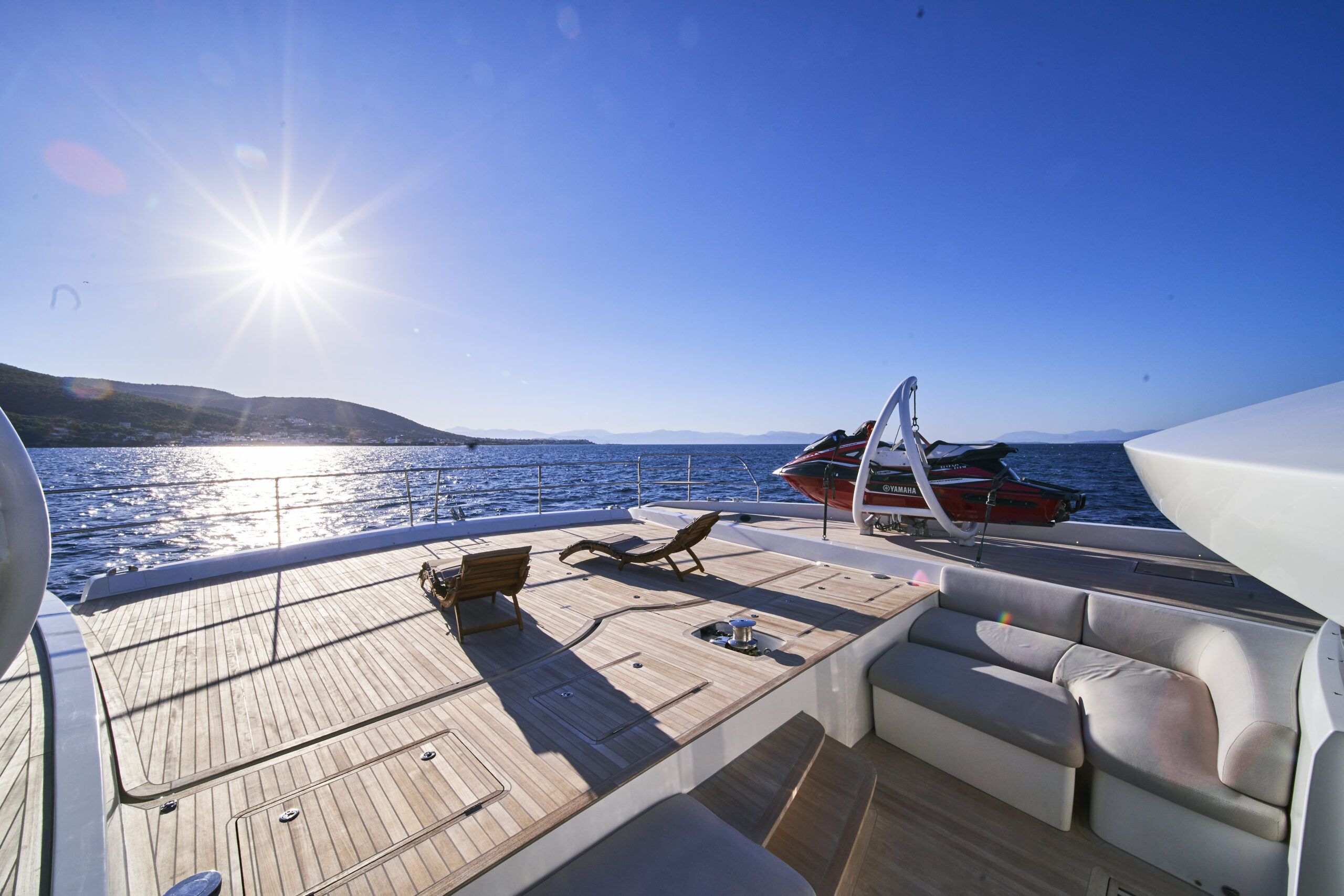Hydraulic swimming platform, full air conditioning system, spacious foredeck with awning, elegant interior design, and cutting-edge amenities, from big screen in the lounge, TV in every cabin to WiFi and wine cooler, create an atmosphere of refined luxury.
